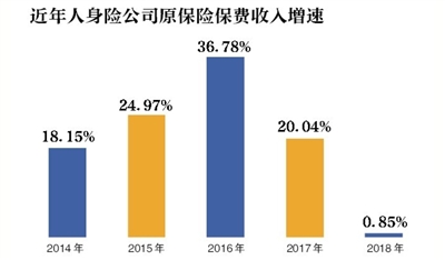 银保监会官网数据显示,去年人身险公司的原保险保费收入达2.63万亿元,同比仅微增0.85%。2014年-2017年,这一指标的同比增幅均为两位数,分别达18.15%、24.97%、36.78%以及20.04%。也就是说,2018年的原保险保费收入增速,是近五年来最缓慢的一年。