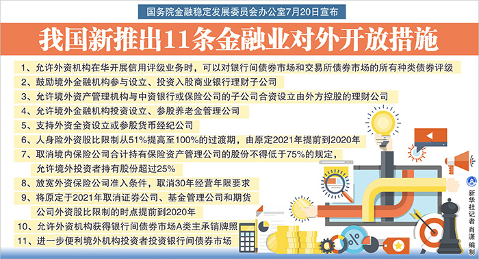 新华社北京7月20日电(记者吴雨)国务院金融稳定发展委员会办公室20日对外宣布,为贯彻落实党中央、国务院关于进一步扩大对外开放的决策部署,按照“宜快不宜慢、宜早不宜迟”的原则,在深入研究评估的基础上,推出以下11条金融业对外开放措施: