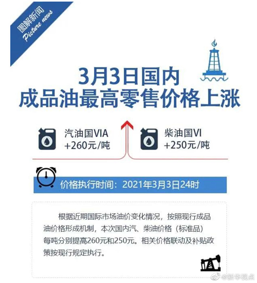 摘要:国家发展改革委3日称,自2021年3月3日24时起,国内汽油、柴油价格每吨分别提高260元和250元。本轮成品油调价周期内,国际油价继续大幅上涨。国家发展改革委价格监测中心预计,短期内油价震荡运行的可能性较大。(记者戴小河、安蓓)