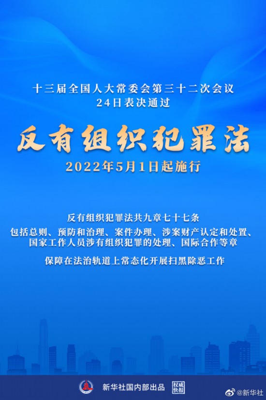 十三届全国人大常委会第三十二次会议24日表决通过《中华人民共和国反有组织犯罪法》。反有组织犯罪法系统总结扫黑除恶专项斗争实践经验,保障在法治轨道上常态化开展扫黑除恶工作,自2022年5月1日起施行。