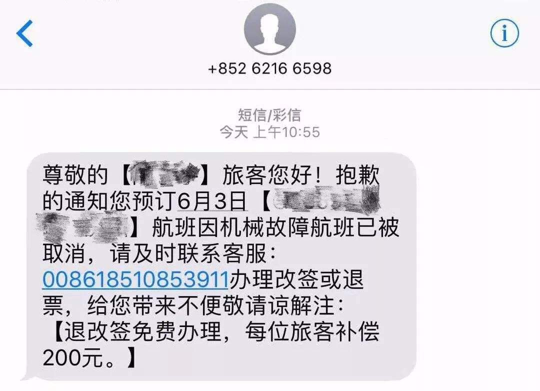 骗子利用非法手段获知购票人的个人信息后,便会假冒工作人员,以发短信的形式,通知购票人乘坐的航班或列车延误或取消,需要改签或退票,并给出一定的经济补偿,还会留有所谓的“客服电话”。