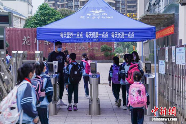 资料图:学生佩戴口罩并进行体温监测后进入校园。陈冠言摄