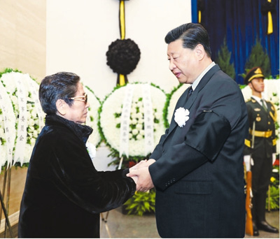 7月29日,李鹏同志遗体在北京八宝山革命公墓火化。习近平、李克强、栗战书、汪洋、王沪宁、赵乐际、韩正、王岐山、江泽民等前往八宝山送别,胡锦涛在外地送花圈表示哀悼。这是习近平与李鹏亲属握手,表示深切慰问。