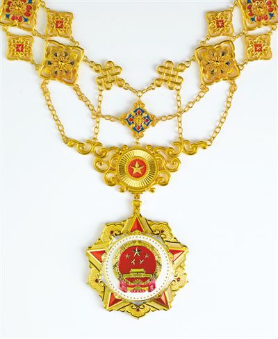 国家荣誉称号奖章以红色、金色为主色调,章体采用五星、天安门、牡丹、旗帜、光芒等元素,章链采用中国结、花卉等元素,整体使用冷压成型、花丝镶嵌、珐琅等工艺制作,象征国家荣誉称号获得者在各领域各行业作出的重大贡献,彰显示范引领作用,激励全国各族人民不忘初心、牢记使命,为实现中华民族伟大复兴的中国梦而不懈奋斗。