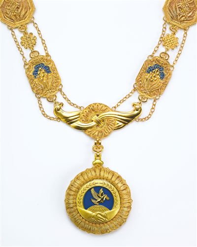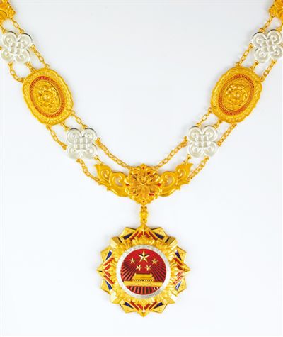 “友谊勋章”以金色、蓝色为主色调,章体采用和平鸽、地球、握手、荷花等元素,章链采用中国结、万年青、牡丹、玉璧、兰草等元素,整体使用花丝镶嵌、掐丝珐琅等传统工艺手工制作,象征中国人民同各国人民友好团结、友谊长存,祝愿世界各国共同繁荣发展。