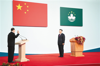 12月20日,庆祝澳门回归祖国20周年大会暨澳门特别行政区第五届政府就职典礼在澳门东亚运动会体育馆隆重举行。中共中央总书记、国家主席、中央军委主席习近平出席并发表重要讲话。