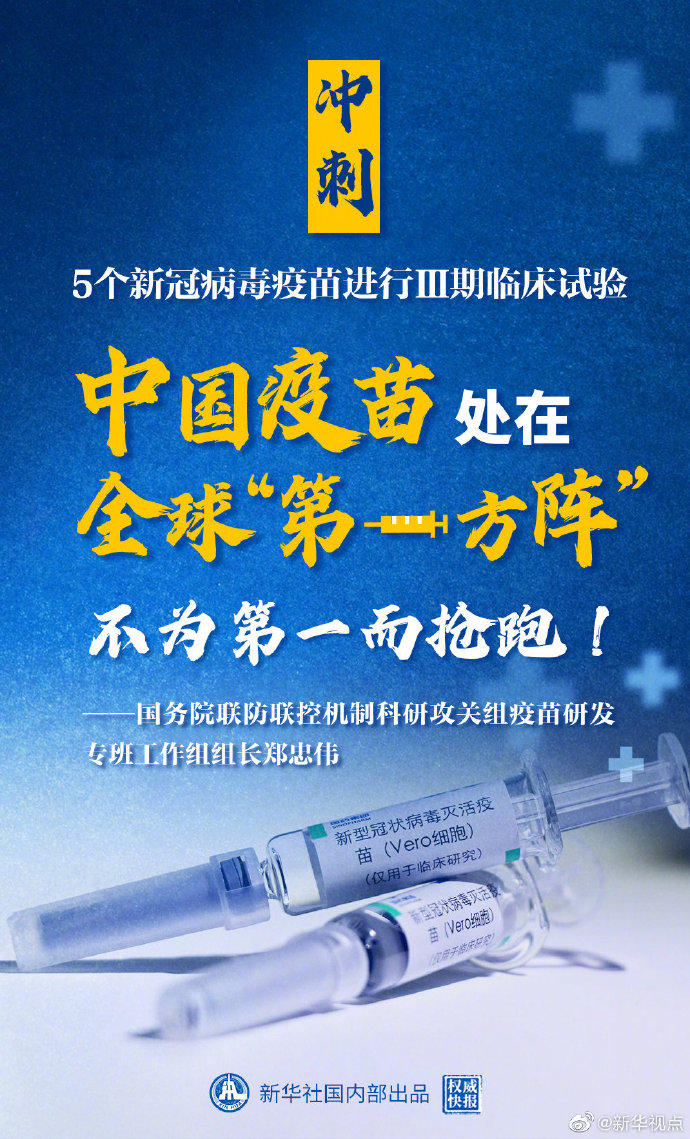 新华社北京12月16日电(记者陈芳、董瑞丰)“我国目前已有5个新冠病毒疫苗进行Ⅲ期临床试验,数量位于全球前列。”国务院联防联控机制科研攻关组疫苗研发专班工作组组长、国家卫健委医药卫生科技发展研究中心主任郑忠伟日前接受新华社记者专访时说,“疫苗研发已经进入冲刺阶段,我们处于全球第一方阵,但不为第一而抢跑。”