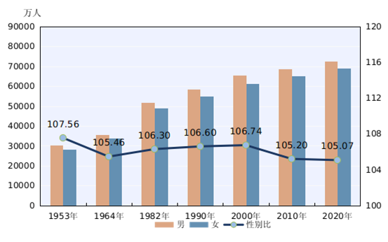 在性别构成方面,数据显示,男性人口为72334万人,占51.24%;女性人口为68844万人,占48.76%。总人口性别比(以女性为100,男性对女性的比例)为105.07,与2010年基本持平,略有降低。出生人口性别比为111.3,较2010年下降6.8。我国人口的性别结构持续改善。