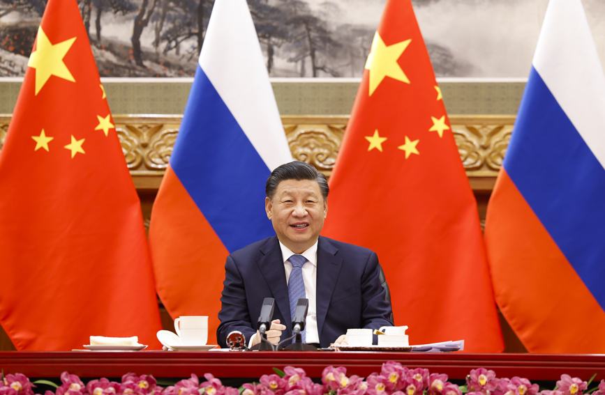 习近平强调,当前,世界百年变局和世纪疫情交织影响,世界进入动荡变革期。中俄关系经受住各种风浪考验,展示出新的生机活力。我同总统先生通过多种方式就重大议题保持沟通和协调,共同为中俄关系把舵领航。双方正式宣布《中俄睦邻友好合作条约》延期并赋予其新的时代内涵,在涉及彼此核心利益问题上坚定相互支持,捍卫了各自国家尊严和两国共同利益。