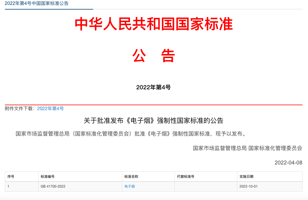 人民网北京4月12日电 (记者李楠桦)据国家标准化管理委员会官方网站消息,近日,国家市场监督管理总局、国家标准化管理委员会批准《电子烟》强制性国家标准,现予以发布,自2022年10月1日起实施。
