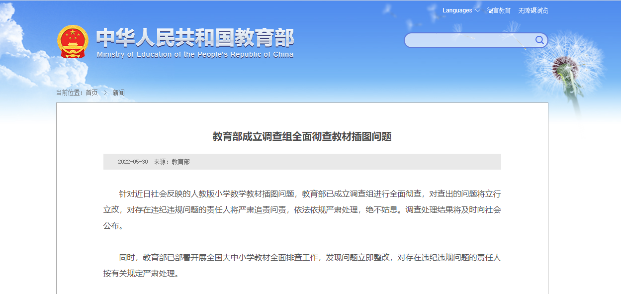 同时,教育部已部署开展全国大中小学教材全面排查工作,发现问题立即整改,对存在违纪违规问题的责任人按有关规定严肃处理。