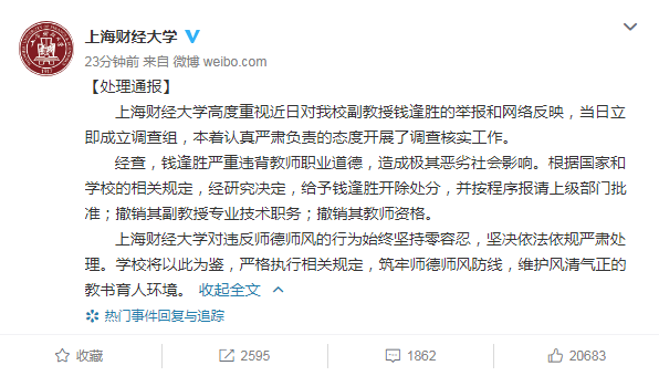 人民网北京12月9日电(冯粒) 9日晚,上海财经大学官方微博发布一则声明,回应该校教师钱某的师德师风问题。声明称:上海财经大学高度重视近日对我校副教授钱逢胜的举报和网络反映,当日立即成立调查组,本着认真严肃负责的态度开展了调查核实工作。