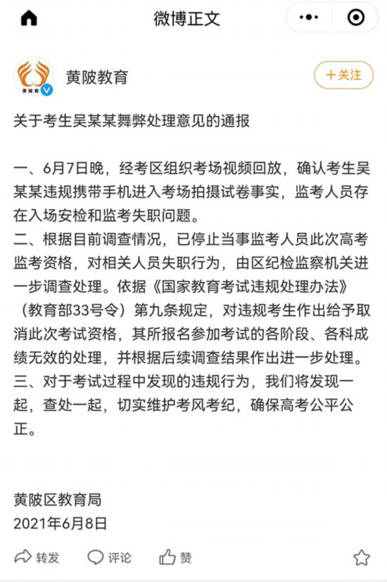 武汉市黄陂区教育局官方微博同日发布《关于考生吴某某舞弊处理意见的通报》。已经连夜处理该事件,已对涉事学生的作弊行为进行了认定,学生也已经承认了自己的作弊行为。