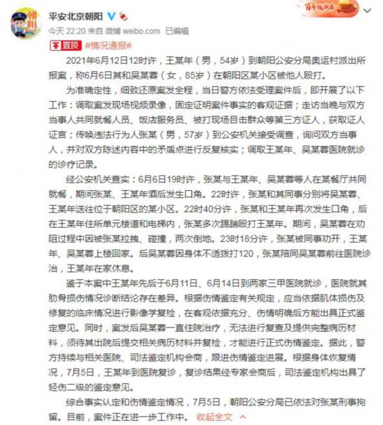 2021年6月12日12时许,王某年(男,54岁)到朝阳公安分局奥运村派出所报案,称6月6日其和吴某蓉(女,85岁)在朝阳区某小区被他人殴打。