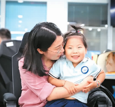 欣欣是一个有些腼腆的女孩。在明亮宽敞的“宝宝班”教室,其他小朋友又跳又闹,她则更喜欢安静地摆弄玩具。直到老师说了一句:“我们要去找欣欣妈妈喽。”欣欣一下子蹦了起来,开心地咧开嘴,原地转起圈。