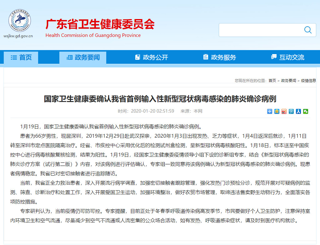广东省卫生健康委员会20日发布消息,1月19日,国家卫生健康委确认广东省首例输入性新型冠状病毒感染的肺炎确诊病例。