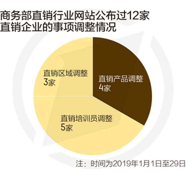 据1℃记者梳理,2019年1月1日至29日,商务部直销行业网站公布过12家直销企业的事项调整情况,其中直销产品调整(4家)、直销培训员调整(5家)、直销区域调整(3家),而这些企业大部分集中在权健公司所在地天津。