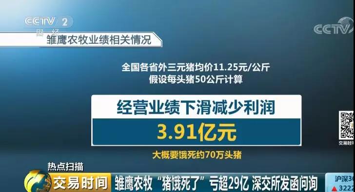上市公司雏鹰农牧日前发布公告称,公司2018年预计亏损29亿元—33亿元,而导致其巨亏的一个很重要的原因是“资金紧张,饲料供应不及时,公司生猪养殖死亡率高于预期”。雏鹰农牧的这份公告一出,即引起了市场的密切关注,很多投资者想到了一年多前东北一家养殖公司獐子岛曾出现的海底养殖扇贝大量死亡的事件,因此戏谑地说,扇贝还没跑回来,猪又饿死了,资本市场是来了一批说相声的吗?资本市场当然不是说相声的地方,上市公司发布的公告是具有法律效力的。但是雏鹰农牧一下子要预亏30亿元左右,仍然让人难以接受。雏鹰农牧是一家农牧类上市公司,这类企业与工业类企业不一样的是,它们的生产经营在一定程度上存在着“看天吃饭”的特点,一旦遭遇自然灾害,公司经营确实会遭遇重创甚至毁灭性打击。一年多前发生的獐子岛扇贝死亡事件,就是因为寒流的袭击导致海底扇贝大量死亡。当然,雏鹰农牧是以生猪养殖为主营的企业,遭遇自然灾害的风险要小得多,其产品销售较为稳定,经营业绩不应该出现大幅度的起落。因此,在正常年度出现巨亏30亿元,是很难让人信服的。