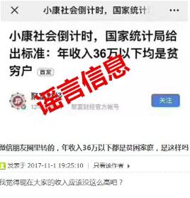 11日,国家统计局官方公众号就网络流传的“国家统计局给出标准:年收入36万以下均是贫困户”信息进行回应,国家统计局从未提过上述家庭标准!我国只有现行国家农村贫困标准,也就是:基本生活消费低于每人每年2300元(按2010年不变价),按此标准测算,2018年末,全国农村贫困人口1660万人,比上年末减少1386万人。