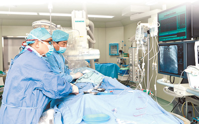 中国医学科学院阜外医院手术室内,医生在实施经导管主动脉瓣膜置换手术。 |