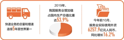 过去两年,我国宣布了众多金融业开放措施,以金融业为代表的服务业开放成为我国全面扩大对外开放的“重头戏”。“十三五”以来,我国服务业对外开放新举措密集出台,服务业开放步履铿锵。统计显示,今年前10月,服务业实际使用外资6257.9亿元,同比增长16.2%。