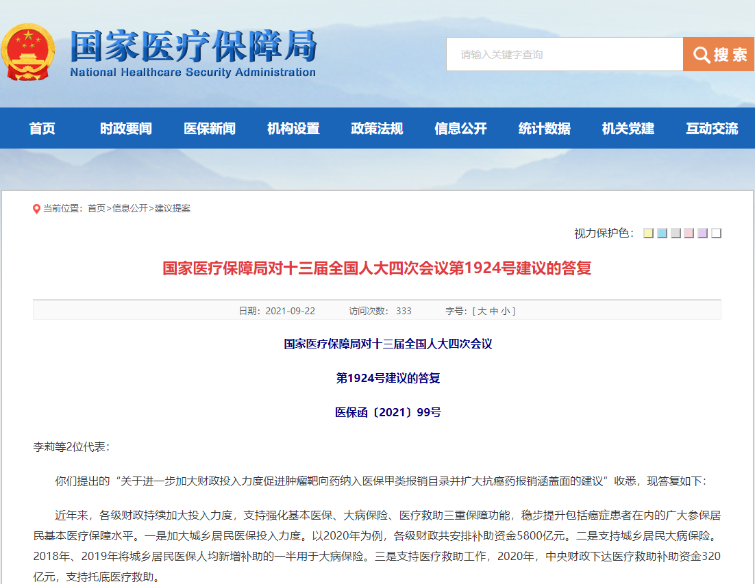 对于促进肿瘤靶向药纳入医保甲类报销目录,国家医保局称,我国目前基本医疗保险筹资水平较低。2020年城乡居民医保人均仅为800元左右,保障能力有限。而抗肿瘤治疗用药普遍价格昂贵,因此将其纳入医保甲类药品管理的条件尚不成熟。今后将完善医保目录动态调整机制,将更多符合条件的抗肿瘤药按程序纳入报销目录。