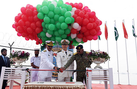 开幕式上,“海洋卫士-2020”海上联演中巴双方总导演为开幕式剪彩。记者 穆瑞林 摄