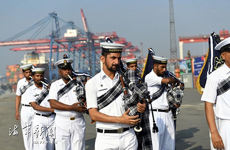 当地时间1月4日,巴基斯坦海军官兵在卡拉奇港口欢迎中国军舰到港。记者 穆瑞林 摄