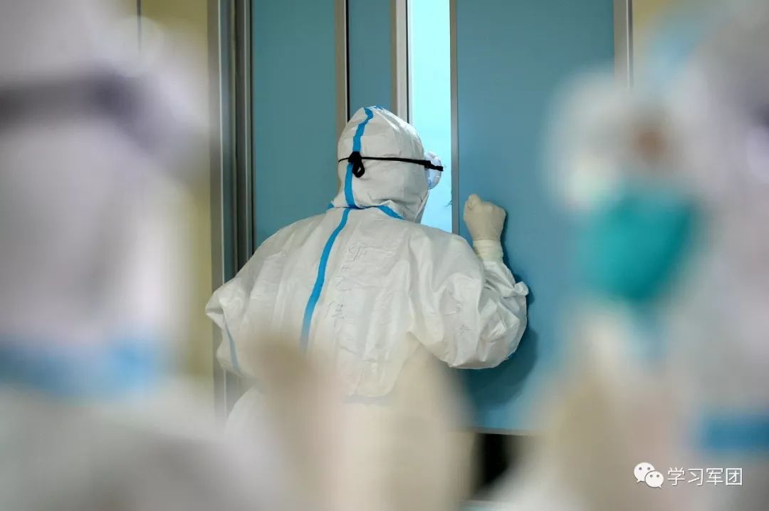 1月27日上午,海军军医大学医疗队医护人员在汉口医院重症监护室对新型冠状病毒感染的肺炎患者进行救治。医护人员与监护室外人员隔门交流。解放军报记者范显海摄