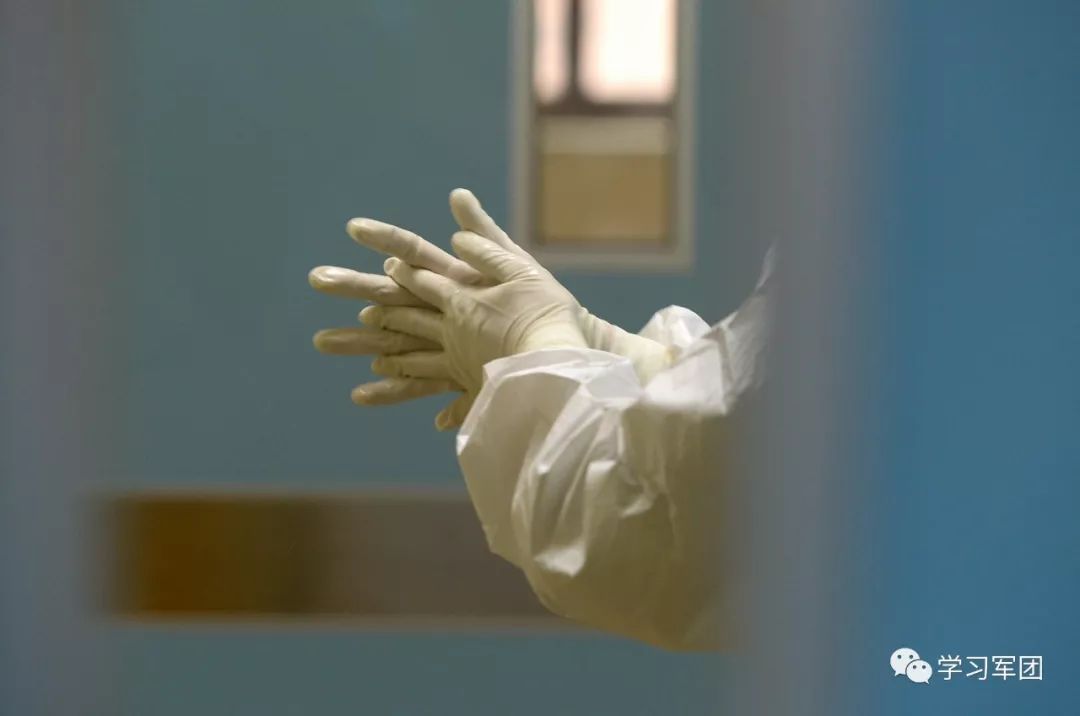 1月27日上午,海军军医大学医疗队医护人员在汉口医院重症监护室对新型冠状病毒感染的肺炎患者进行救治。穿好防护服的医护人员在进入重症监护室前洗手消毒。解放军报记者范显海摄