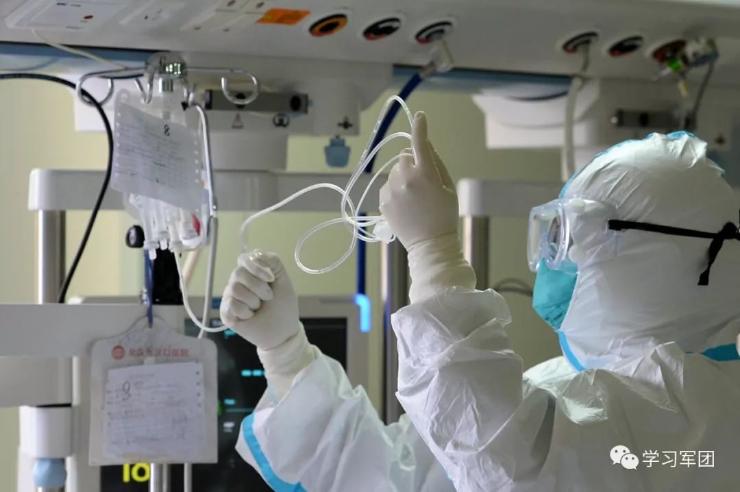 1月27日上午,海军军医大学医疗队医护人员在汉口医院重症监护室对新型冠状病毒感染的肺炎患者进行救治。医护人员对患者进行输液护理。解放军报记者范显海摄