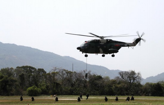 新华社香港3月26日电(孟垂云、易定)特战队员雷霆突击、水面舰艇劈波斩浪、空中战鹰铁翼飞旋……解放军驻香港部队25日出动5艘舰艇、5架各型直升机和陆上作战力量,在香港地区陆海空域组织多兵种检验性联合演练,提升部队全要素、成体系联合制胜能力。