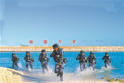 南沙守礁部队官兵代代传承发扬“南沙精神”,爱军精武、苦练本领,用实际行动爱南沙、守南沙、建设南沙。图为守礁官兵正在海边训练。张鹏飞摄