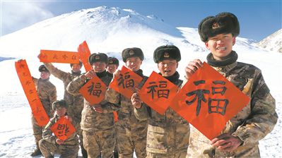 战士们自写春联和“福”字迎接新春佳节的到来。