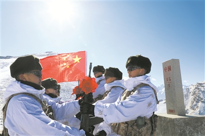 2月7日,陆军某边防连在界碑前为新兵(右)授枪。王军强摄
