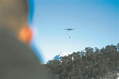 “起飞!”只见胡志民操纵拉杆,无人机垂直升空后,进入航线自主飞行,平稳穿越森林和雪山,向山下飞去。