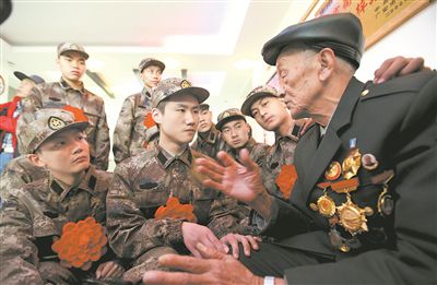 柴云振给来家中探望、即将启程奔赴军营的新兵们讲述战斗故事(资料照片)。新华社发