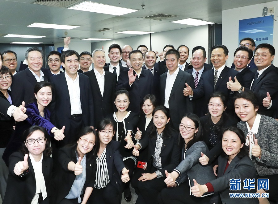 1月4日,中共中央政治局常委、国务院总理李克强到中国银行、中国工商银行、中国建设银行考察,并在银保监会主持召开座谈会。这是李克强在中国建设银行普惠金融事业部考察后与员工合影。新华社记者 庞兴雷 摄