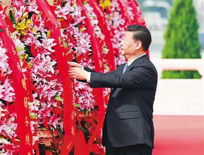 9月30日上午,习近平、李克强、栗战书、汪洋、王沪宁、赵乐际、韩正、王岐山等党和国家领导人来到北京天安门广场,出席烈士纪念日向人民英雄敬献花篮仪式。这是习近平整理花篮上的缎带。
