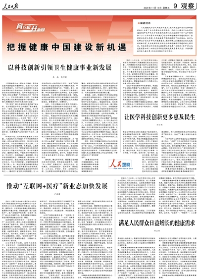 人民健康是社会文明进步的基础,是民族昌盛和国家富强的重要标志,也是广大人民群众的共同追求。党的十九届五中全会审议通过的《中共中央关于制定国民经济和社会发展第十四个五年规划和二〇三五年远景目标的建议》对全面推进健康中国建设提出了重要要求和重大举措,为实施健康中国战略提供了行动指南。面对人民群众多层次多样化的健康需求,要把保障人民健康放在优先发展的战略位置,充分发挥科技创新对全面推进健康中国建设的支撑作用。科技创新如何引领卫生健康事业新发展?“互联网+医疗”新业态发展前景如何?如何让医学科技创新成果更多惠及民生?本期观察版刊发几篇文章,对这些问题进行分析探讨。