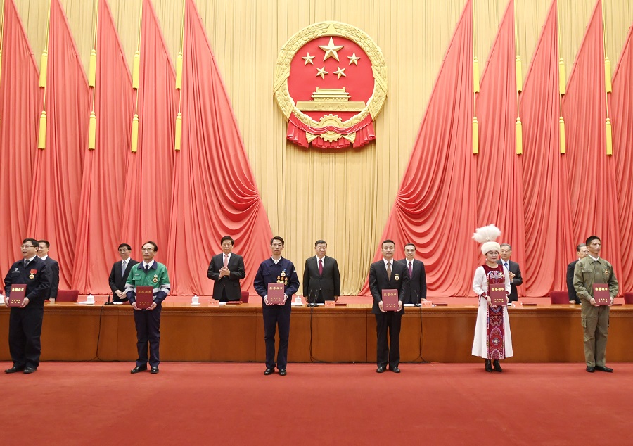 在欢快的乐曲声中,全国劳动模范和先进工作者代表依次登上主席台,习近平等为他们颁发荣誉证书。