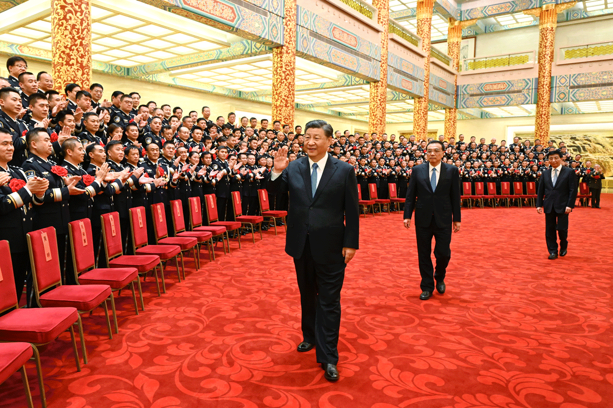 5月25日,党和国家领导人习近平、李克强、王沪宁等在北京人民大会堂会见全国公安系统英雄模范立功集体表彰大会代表。新华社记者 李学仁 摄