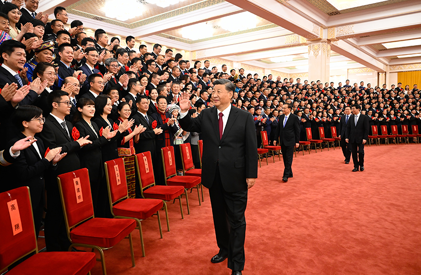 上午11时,习近平等来到人民大会堂北大厅,全场响起热烈掌声。习近平等走到代表们中间,同大家亲切交流并合影留念。