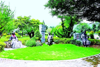 坐落在福州三山人文纪念园的“福州三大才女”——冰心(左)、林徽因(中)、庐隐雕像。